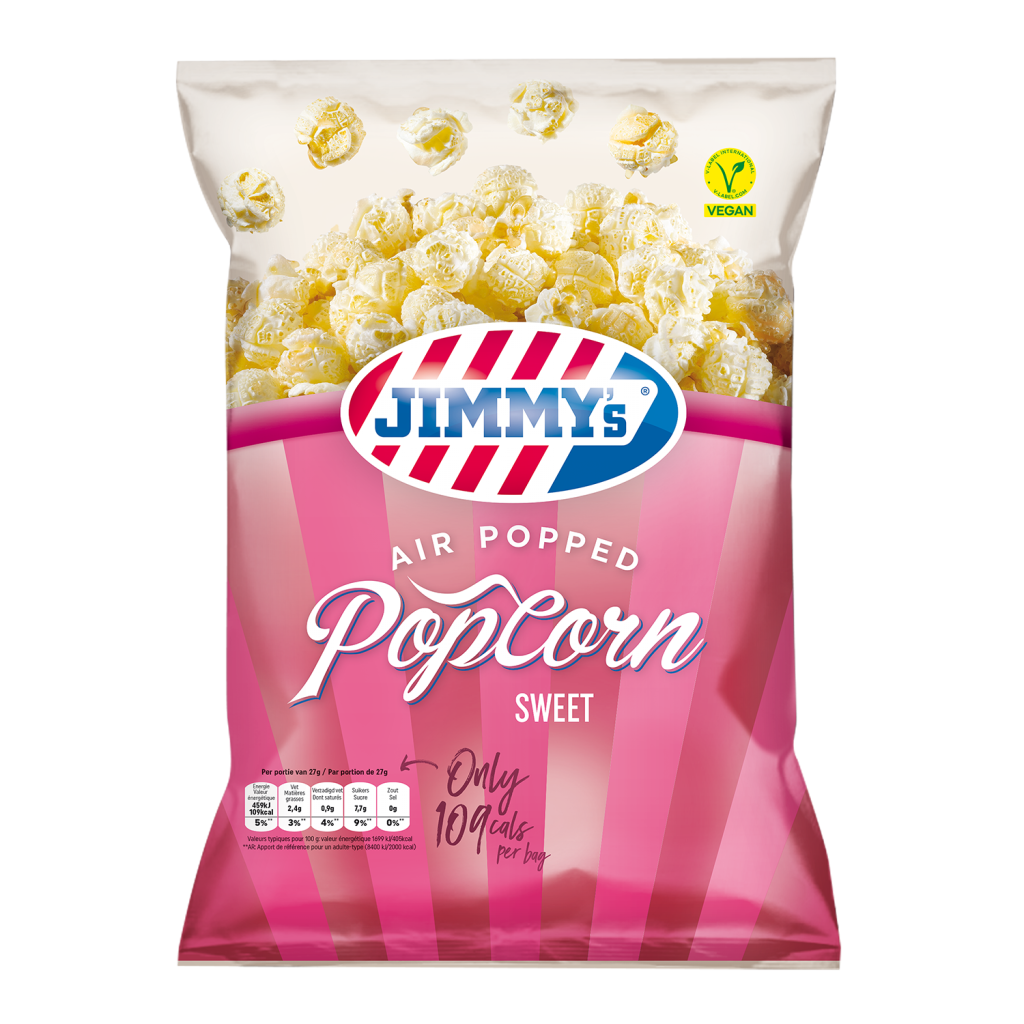 Le pop-corn JIMMY’s soufflé à l’air est fabriqué à partir d’ingrédients les plus naturels. Nous utilisons un système de production spécifique avec lequel le maïs entier est soufflé à l’air chaud. La technique du soufflage à l’air chaud permet de produire un pop-corn avec une texture légère et moelleuse avec un goût prononcé de maïs pure. Le pop-corn JIMMY’s est plus faible en gras, en sucre et en sel que le pop-corn ordinaire et est naturellement riche en fibres nutritionnelles saines.